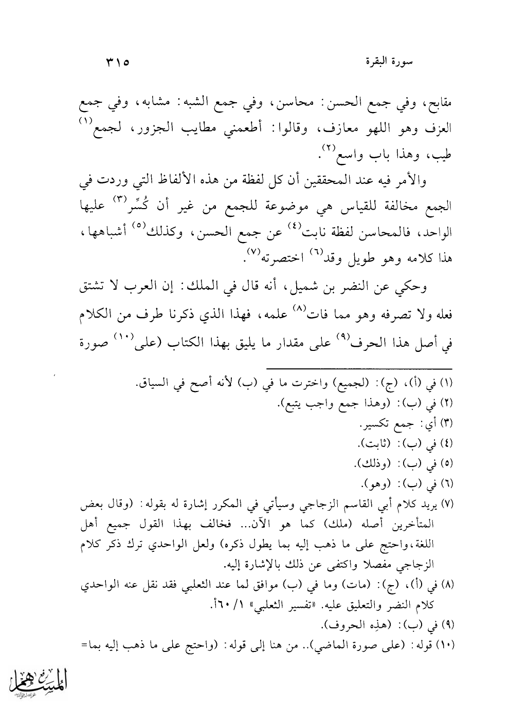 (¬8) في (أ)، (ج): (مات) وما في (ب) موافق لما عند الثعلبي فقد نقل عنه الواحدي كلام النضر والتعليق عليه. "تفسير الثعلبي" 1/ 60 أ.