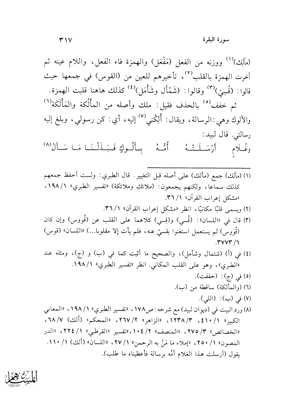 (¬8) ورد البيت في (ديوان لبيد) مع شرحه: ص 178، "تفسير الطبري" 1/ 198، "المعاني الكبير" 1/ 410، 3/ 1238، "الزاهر" 2/ 267، "المحكم" (أَلك) 7/ 68، "الخصائص" 3/ 275، "المنصف" 2/ 104، "تفسير القرطبي" 1/ 224، "الدر المصون" 1/ 250، "إملاء ما مَنَّ به الرحمن" 1/ 27، "اللسان" (ألك) 1/ 110. يقول (أرسلت هذا الغلام أمُّه برسالة فأعطيناه ما طلب).