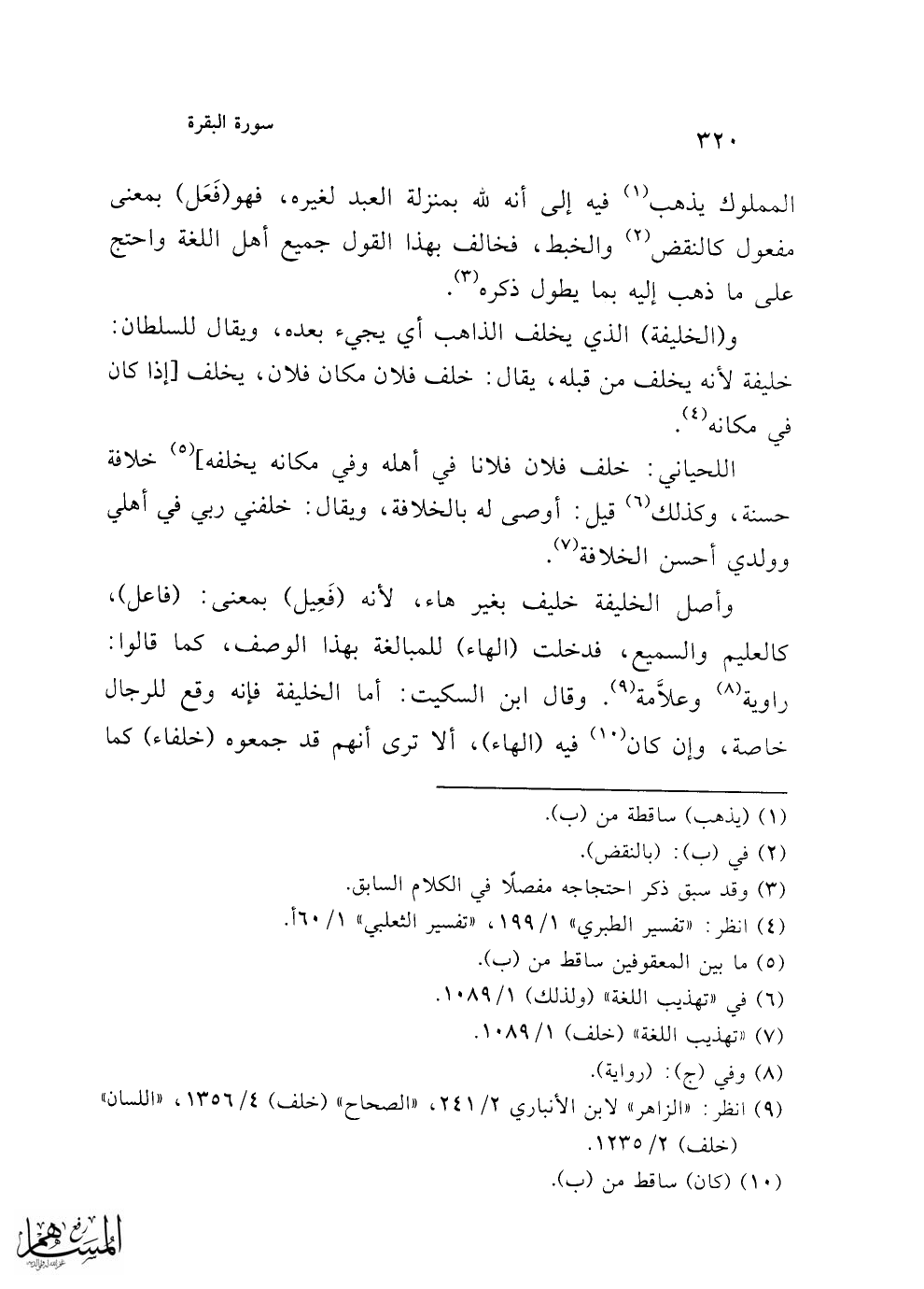 وأصل الخليفة خليف بغير هاء، لأنه (فَعِيل) بمعنى: (فاعل)، كالعليم والسميع، فدخلت (الهاء) للمبالغة بهذا الوصف، كما قالوا: راوية (¬8) وعلاَّمة (¬9). وقال ابن السكيت: أما الخليفة فإنه وقع للرجال خاصة، وإن كان (¬10) فيه (الهاء)، ألا ترى أنهم قد جمعوه (خلفاء) كما