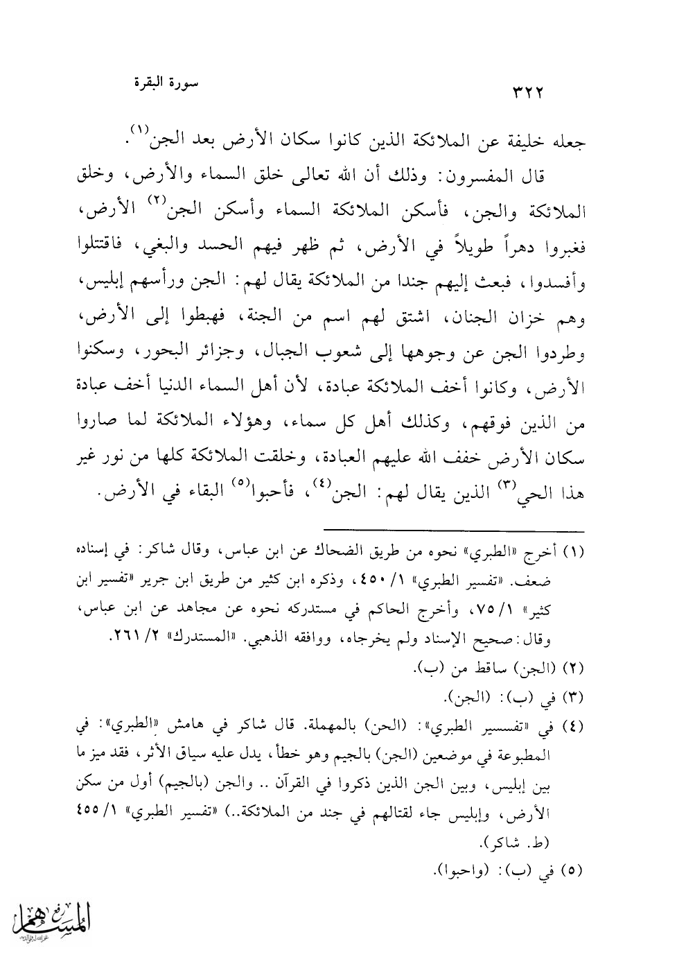 (¬4) في "تفسير الطبري": (الحن) بالمهملة. قال شاكر في هامش "الطبري": في المطبوعة في موضعين (الجن) بالجيم وهو خطأ، يدل عليه سياق الأثر، فقد ميز ما بين إبليس، وبين الجن الذين ذكروا في القرآن .. والجن (بالجيم) أول من سكن الأرض، وإبليس جاء لقتالهم في جند من الملائكة ..) "تفسير الطبري" 1/ 455 (ط. شاكر).