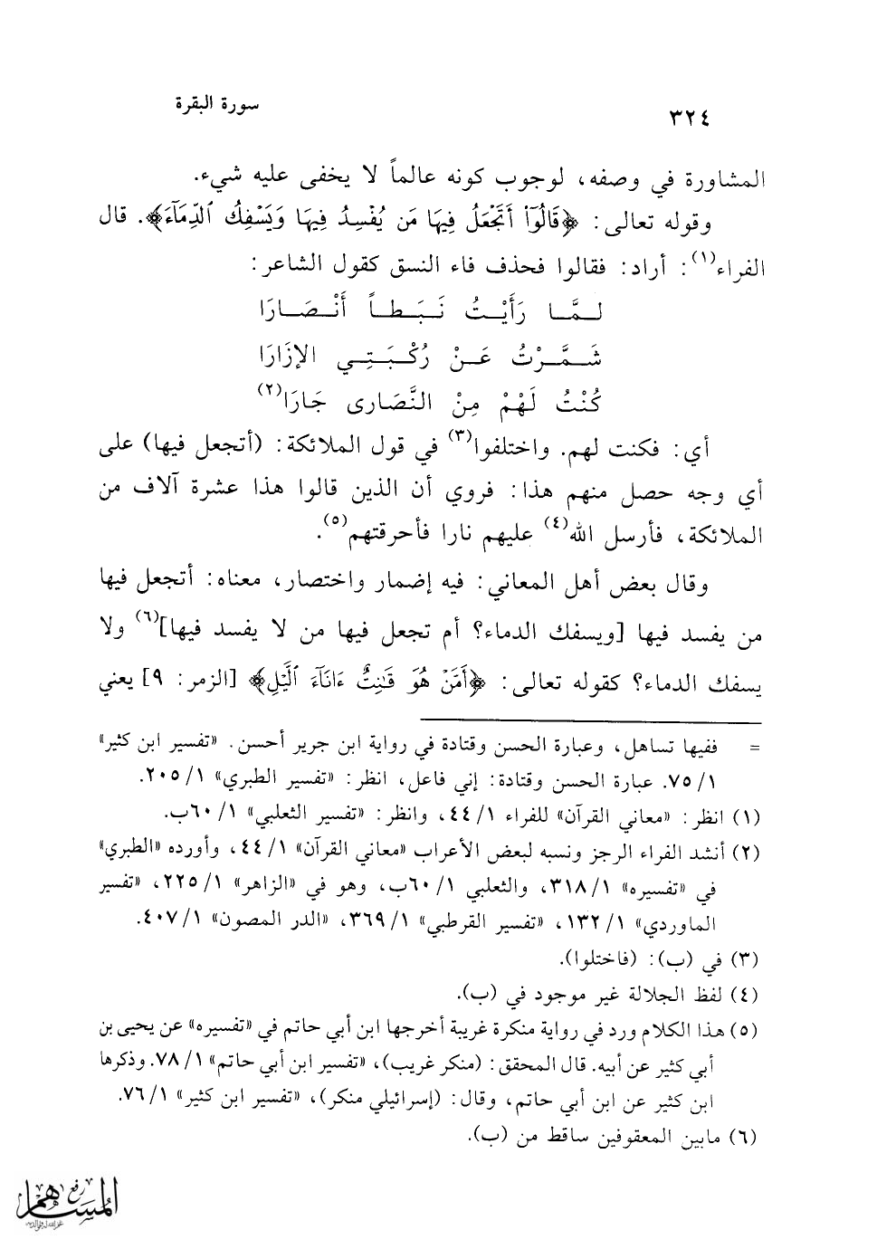 وقوله تعالى: {قَالُوا أَتَجْعَلُ فِيهَا مَنْ يُفْسِدُ فِيهَا وَيَسْفِكُ الدِّمَاءَ}. قال الفراء (¬1): أراد: فقالوا فحذف فاء النسق كقول الشاعر: