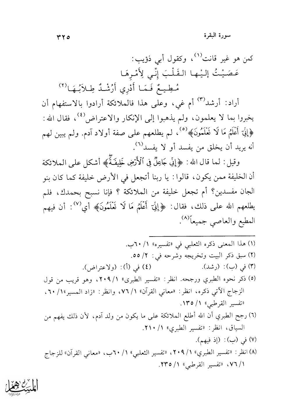 (¬6) رجح الطبري أن الله أطلع الملائكة على ما يكون من ولد آدم، لأن ذلك يفهم من السياق، انظر: "تفسير الطبري" 1/ 210.
