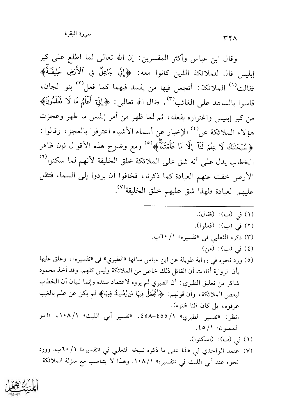 (¬7) اعتمد الواحدي في هذا على ما ذكره شيخه الثعلبي في "تفسيره" 1/ 60 ب. وورد نحوه عند أبي الليث في "تفسيره" 1/ 108. وهذا لا يتناسب مع منزلة الملائكة =
