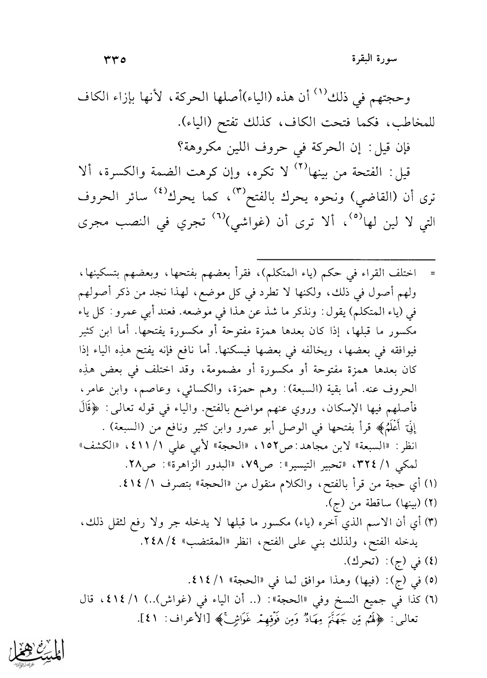 (¬1) أي حجة من قرأ بالفتح، والكلام منقول من "الحجة" بتصرف 1/ 414.