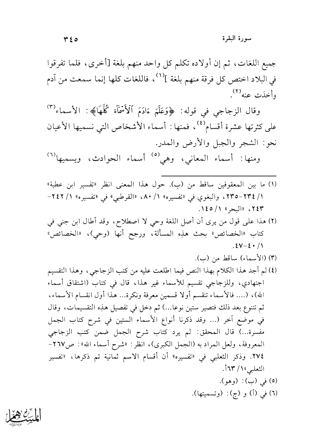 (¬4) لم أجد هذا الكلام بهذا النص فيما اطلعت عليه من كتب الزجاجي، وهذا التقسيم اجتهادي، وللزجاجي تقسيم للأسماء غير هذا، قال في كتاب (اشتقاق أسماء الله)، (.... فالأسماء تنقسم أولا قسمين معرفة ونكرة ... هذا أول انقسام الأسماء، ثم تتنوع بعد ذلك فتصير ستين نوعا ...) ثم دخل في تفصيل هذِه التقسيمات، وقال في موضع آخر (... وقد ذكرنا أنواع الأسماء الستين في شرح كتاب الجمل مفسرة ...) قال المحقق: لم يرد كتاب شرح الجمل ضمن كتب الزجاجي المعروفة، ولعل المراد به (الجمل الكبرى)، انظر: "شرح أسماء الله": ص 267 - 274. وذكر الثعلبي في "تفسيره" أن أقسام الاسم ثمانية ثم ذكرها، "تفسير الثعلبي" 1/ 63 أ.