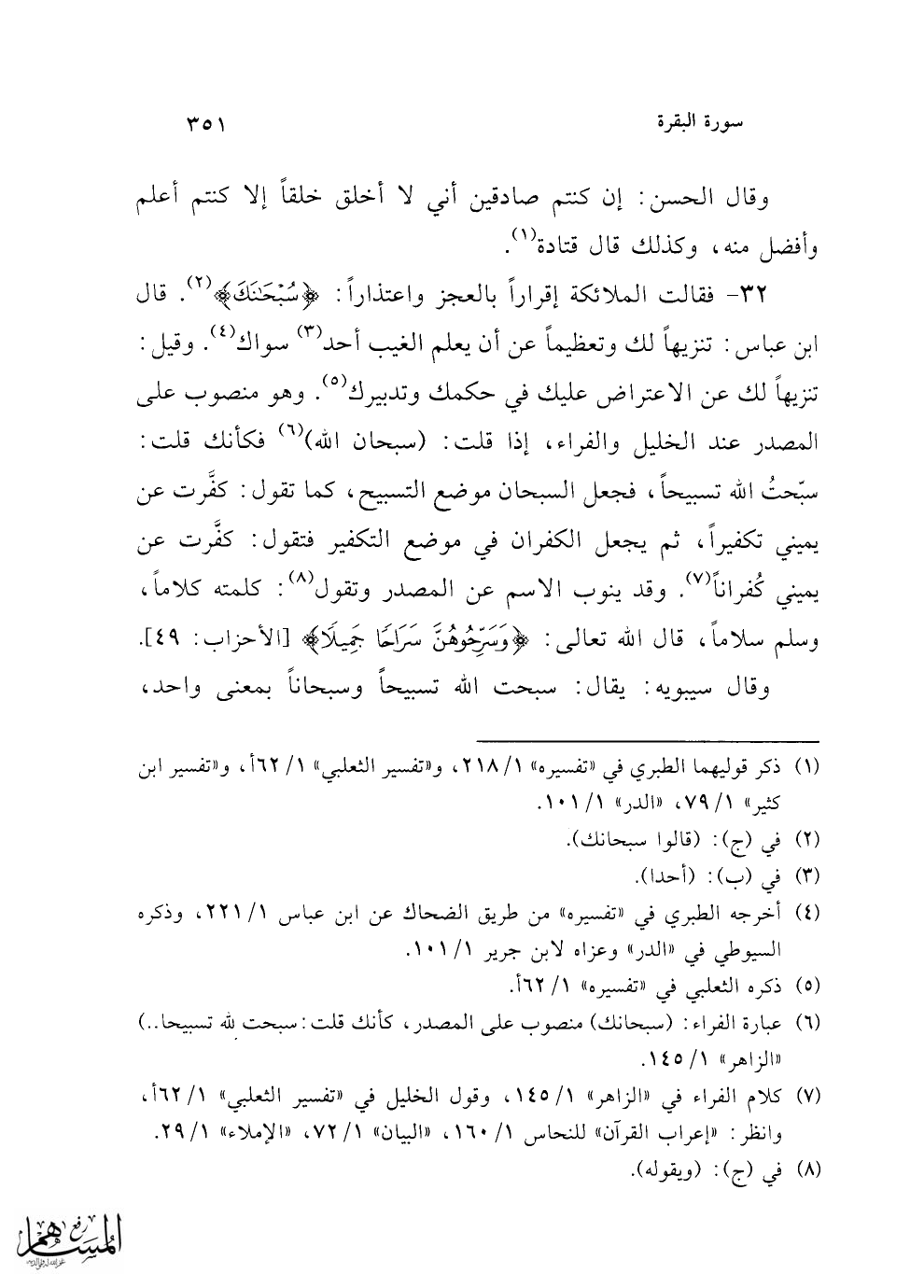(¬6) عبارة الفراء: (سبحانك) منصوب على المصدر، كأنك قلت: سبحت لله تسبيحا ..) "الزاهر" 1/ 145.