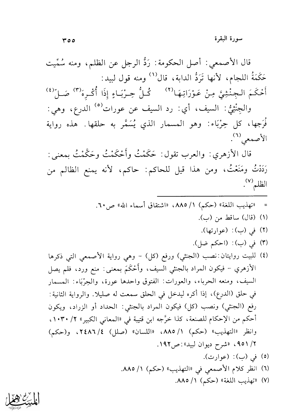 (¬6) انظر كلام الأصمعي في "التهذيب" (حكم) 1/ 885.