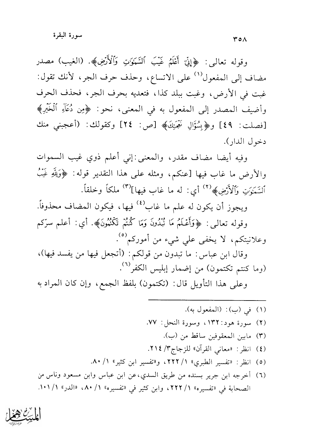 وقوله تعالى: {إِنِّي أَعْلَمُ غَيْبَ السَّمَاوَاتِ وَالْأَرْضِ}. (الغيب) مصدر مضاف إلى المفعول (¬1) على الاتساع، وحذف حرف الجر، لأنك تقول: غبت في الأرض، وغبت ببلد كذا، فتعديه بحرف الجر، فحذف الحرف وأضيف المصدر إلى المفعول به في المعنى، نحو: {مِنْ دُعَاءِ الْخَيْرِ} [فصلت: 49] و {بِسُؤَالِ نَعْجَتِكَ} [ص: 24] وكقولك: (أعجبني منك دخول الدار).