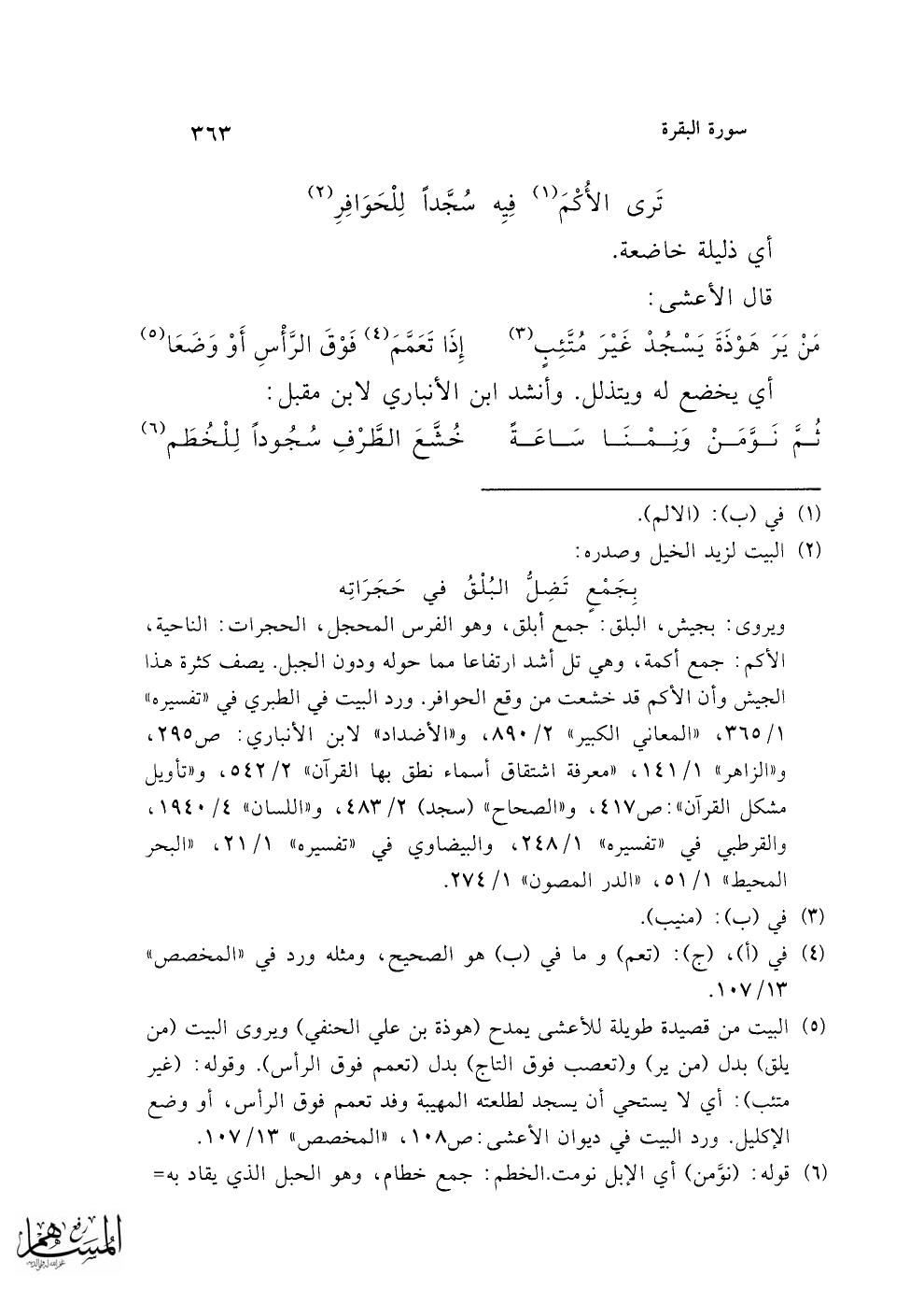 ويروى: بجيش، البلق: جمع أبلق، وهو الفرس المحجل، الحجرات: الناحية، الأكم: جمع أكمة، وهي تل أشد ارتفاعا مما حوله ودون الجبل. يصف كثرة هذا الجيش وأن الأكم قد خشعت من وقع الحوافر. ورد البيت في الطبري في "تفسيره" 1/ 365، "المعاني الكبير" 2/ 890، و"الأضداد" لابن الأنباري: ص 295، و"الزاهر" 1/ 141، "معرفة اشتقاق أسماء نطق بها القرآن" 2/ 542، و"تأويل مشكل القرآن": ص 417، و"الصحاح" (سجد) 2/ 483، و"اللسان" 4/ 1940، والقرطبي في "تفسيره" 1/ 248، والبيضاوي في "تفسيره" 1/ 21، "البحر المحيط" 1/ 51، "الدر المصون" 1/ 274.