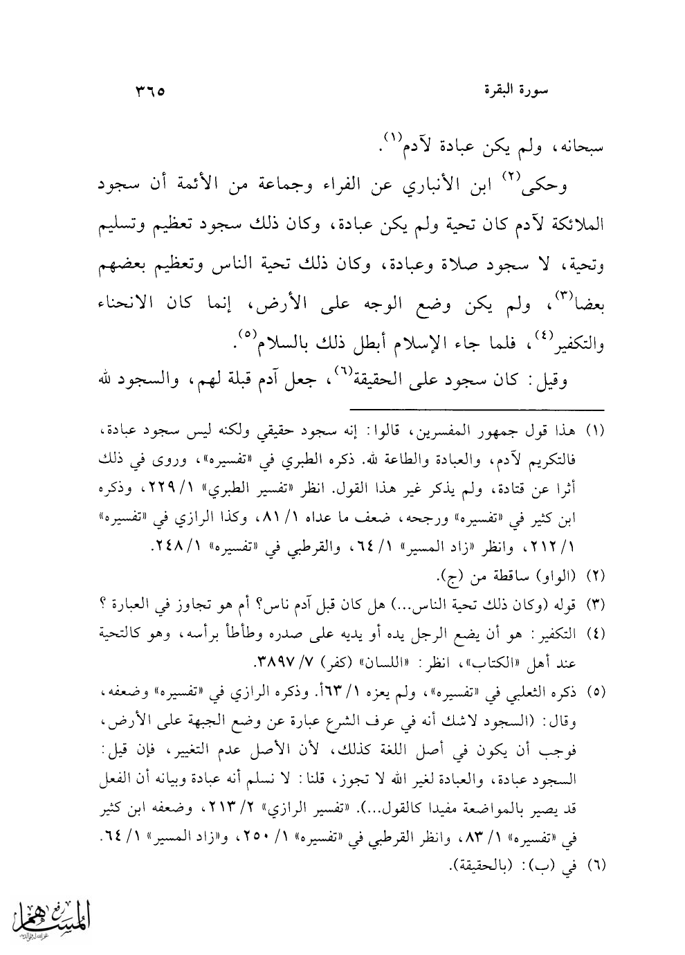 (¬1) هذا قول جمهور المفسرين، قالوا: إنه سجود حقيقي ولكنه ليس سجود عبادة، فالتكريم لآدم، والعبادة والطاعة لله. ذكره الطبري في "تفسيره"، وروى في ذلك أثرا عن قتادة، ولم يذكر غير هذا القول. انظر "تفسير الطبري" 1/ 229، وذكره ابن كثير في "تفسيره" ورجحه، ضعف ما عداه 1/ 81، وكذا الرازي في "تفسيره" 1/ 212، وانظر "زاد المسير" 1/ 64، والقرطبي في "تفسيره" 1/ 248.