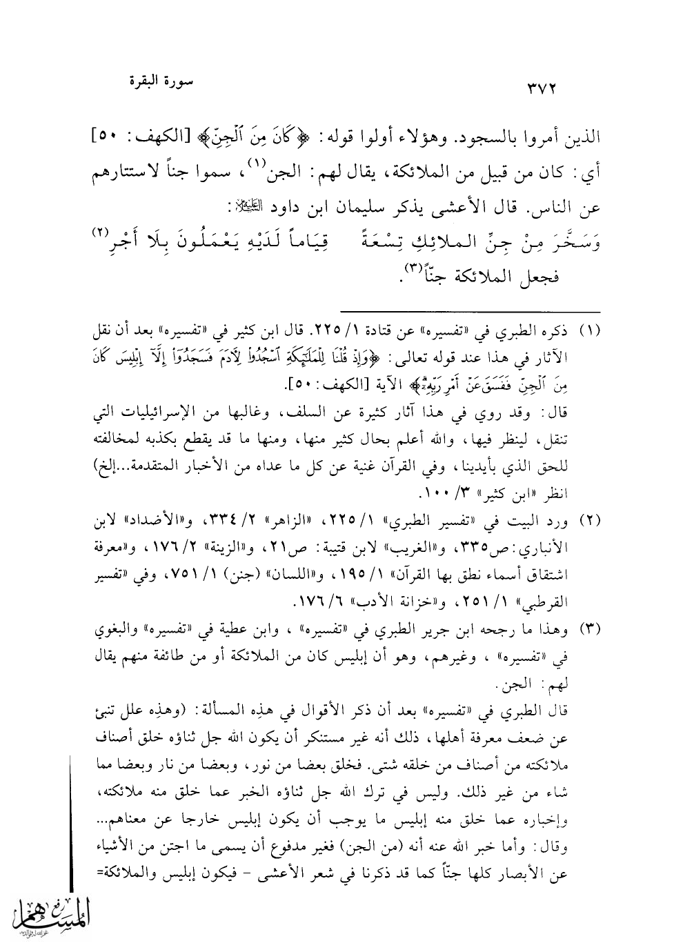 قال الطبري في "تفسيره" بعد أن ذكر الأقوال في هذِه المسألة: (وهذِه علل تنبئ عن ضعف معرفة أهلها، ذلك أنه غير مستنكر أن يكون الله جل ثناؤه خلق أصناف ملائكته من أصناف من خلقه شتى. فخلق بعضا من نور، وبعضا من نار وبعضا مما شاء من غير ذلك. وليس في ترك الله جل ثناؤه الخبر عما خلق منه ملائكته، وإخباره عما خلق منه إبليس ما يوجب أن يكون إبليس خارجا عن معناهم ... وقال: وأما خبر الله عنه أنه (من الجن) لغير مدفوع أن يسمى ما اجتن من الأشياء عن الأبصار كلها جنّاً كما قد ذكرنا في شعر الأعشى -فيكون إبليس والملائكة =