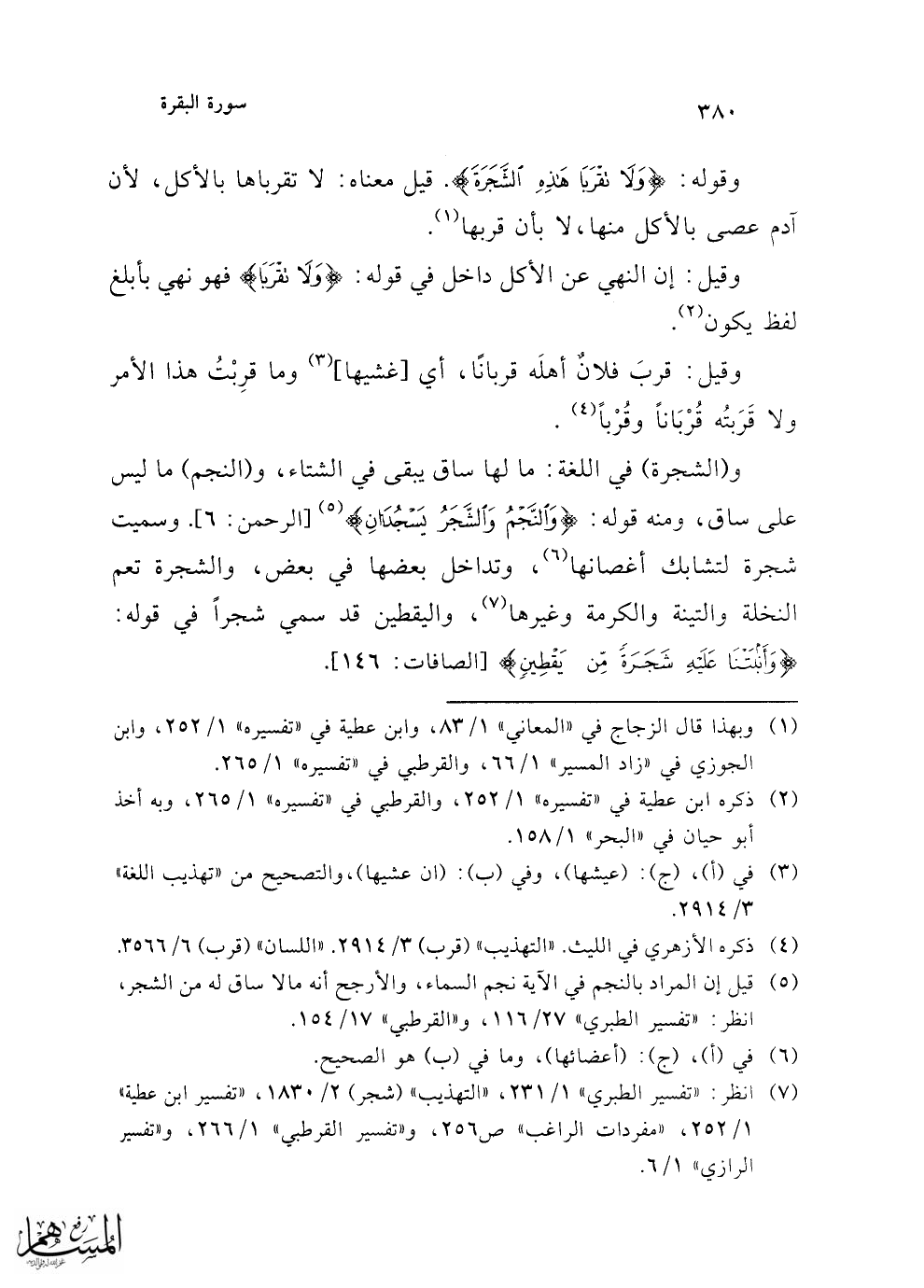 (¬7) انظر: "تفسير الطبري" 1/ 231، "التهذيب" (شجر) 2/ 1830، "تفسير ابن عطية" 1/ 252، "مفردات الراغب" ص 256، و"تفسير القرطبي" 1/ 266، و"تفسير الرازي" 1/ 6.