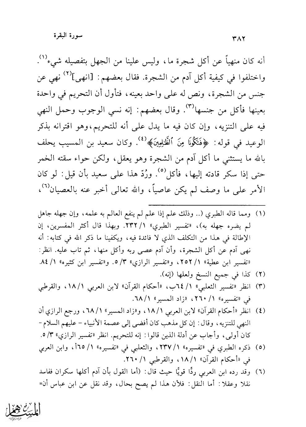 (¬4) انظر "أحكام القرآن" لابن العربي 1/ 18، و"زاد المسير" 1/ 68، ورجع الرازي أن النهي للتنزيه، وقال: إن كل مذهب كان أفضى إلى عصمة الأنبياء -عليهم السلام- كان أولى، وأجاب عن أدلة الذين قالوا: إنه للتحريم. انظر "تفسير الرازي" 3/ 5.