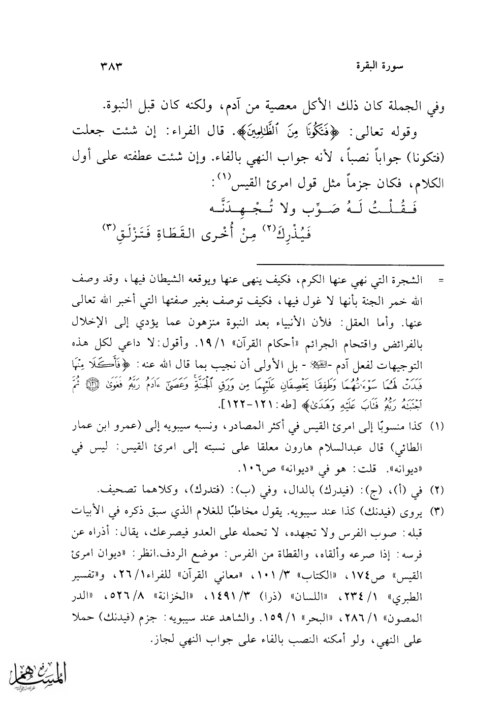 وقوله تعالى: {فَتَكُونَا مِنَ الظَّالِمِينَ}. قال الفراء: إن شئت جعلت (فتكونا) جواباً نصباً، لأنه جواب النهي بالفاء. وإن شئت عطفته على أول الكلام، فكان جزماً مثل قول امرئ القيس (¬1):