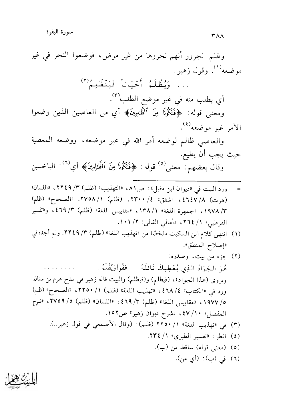 (¬3) في "تهذيب اللغة" 1/ 2250 (ظلم): (وقال الأصمعي في قول زهير ..).