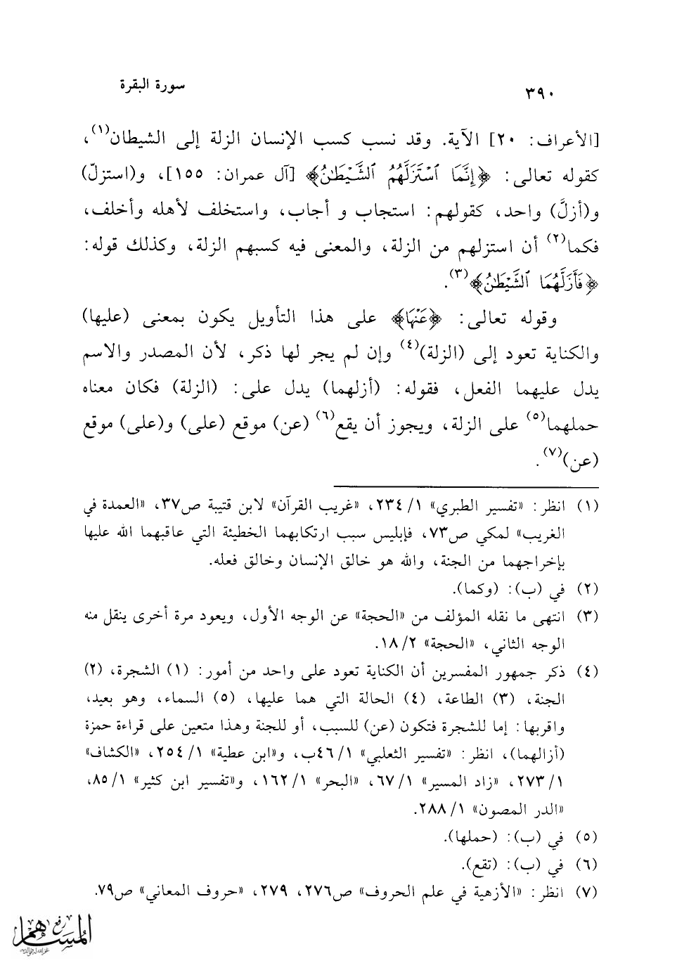 (¬4) ذكر جمهور المفسرين أن الكناية تعود على واحد من أمور: (1) الشجرة، (2) الجنة، (3) الطاعة، (4) الحالة التي هما عليها، (5) السماء، وهو بعيد، وأقربها: إما للشجرة فتكون (عن) للسبب، أو للجنة وهذا متعين على قراءة حمزة (أزالهما)، انظر: "تفسير الثعلبي" 1/ 46 ب، و"ابن عطية" 1/ 254، "الكشاف" 1/ 273، "زاد المسير" 1/ 67، "البحر" 1/ 162، و"تفسير ابن كثير" 1/ 85، "الدر المصون" 1/ 288.