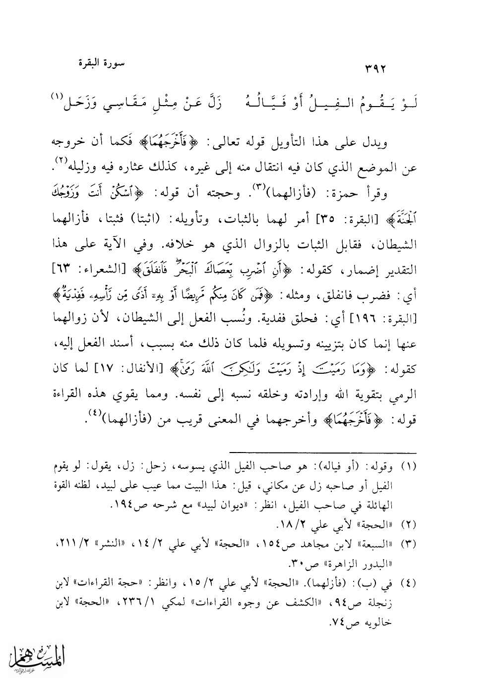 (¬4) في (ب): (فأزلهما). "الحجة" لأبي علي 2/ 15، وانظر: "حجة القراءات" لابن زنجلة ص 94، "الكشف عن وجوه القراءات" لمكي1/ 236، "الحجة" لابن خالويه ص 74.