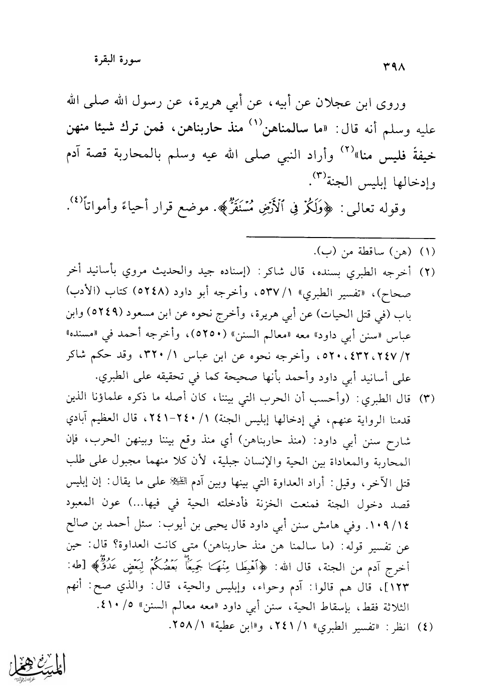 (¬3) قال الطبري: (وأحسب أن الحرب التي بيننا، كان أصله ما ذكره علماؤنا الذين قدمنا الرواية عنهم، في إدخالها إبليس الجنة) 1/ 240 - 241، قال العظيم آبادي شارح سنن أبي داود: (منذ حاربناهن) أي منذ وقع بيننا وبينهن الحرب، فإن المحاربة والمعاداة بين الحية والإنسان جبلية، لأن كلا منهما مجبول على طلب قتل الآخر، وقيل: أراد العداوة التي بينها وبين آدم عليه السلام ما يقال: إن إبليس قصد دخول الجنة فمنعت الخزنة فأدخلته الحية في فيها ...) عون المعبود 14/ 109. وفي هامش سنن أبي داود قال يحيى بن أيوب: سئل أحمد بن صالح عن تفسير قوله: (ما سالمنا هن منذ حاربناهن) متى كانت العداوة؟ قال: حين أخرج آدم من الجنة، قال الله: {اهْبِطَا مِنْهَا جَمِيعًا بَعْضُكُمْ لِبَعْضٍ عَدُوٌّ} [طه: 123]، قال هم قالوا: آدم وحواء، وإبليس والحية، قال: والذي صح: أنهم الثلاثة فقط، بإسقاط الحية، سنن أبي داود "معه معالم السنن" 5/ 410.