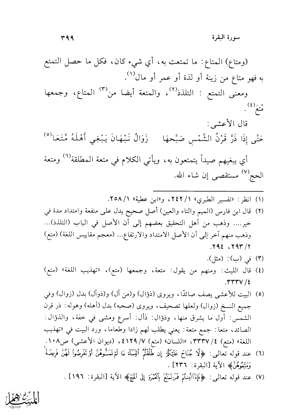 (¬5) البيت للأعشى يصف صائدا، ويروى (ذؤال) و (من آل) و (ذوآل) بدل (زوال) وفي جميع النسخ (زوال) ولعلها تصحيف، ويروى (صحبه) بدل (أهله) وهوله: ذر قرن الشمس: أول ما يشرق منها، وذؤال: ذأل: أسرع ومشى في خفة، والذؤال: الصائد، متعا: جمع متعة: يعني يطلب لهم زادا وطعاما، ورد البيت في "تهذيب اللغة" (متع) 4/ 3337، "اللسان" (متع) 7/ 4129، (ديوان الأعشى) ص108.
