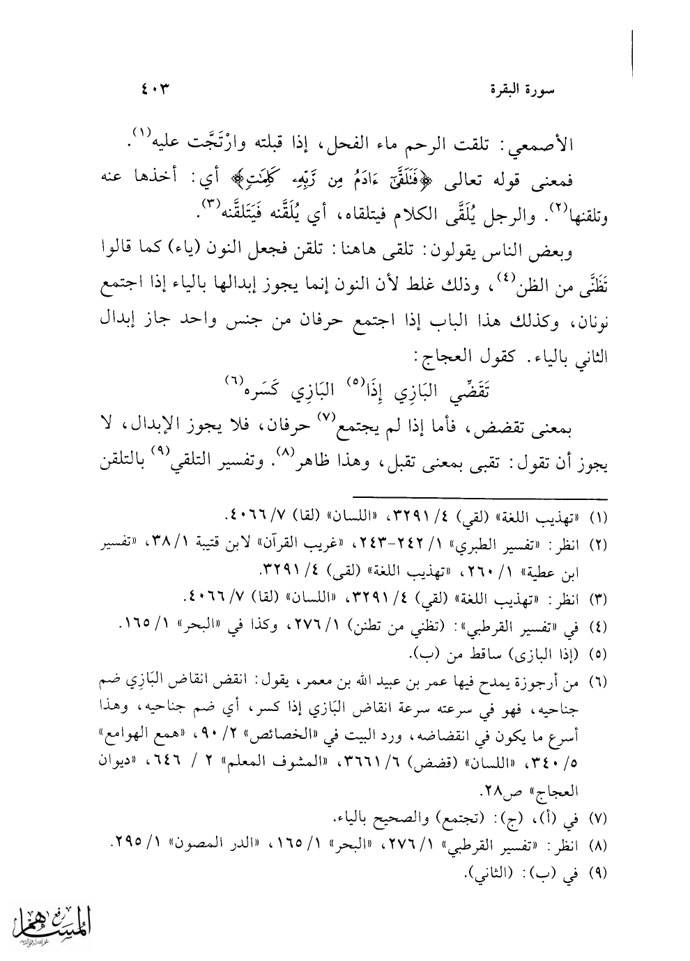 (¬2) انظر: "تفسير الطبري" 1/ 242 - 243، "غريب القرآن" لابن قتيبة 1/ 38، "تفسير ابن عطية" 1/ 260، "تهذيب اللغة" (لقى) 4/ 3291.