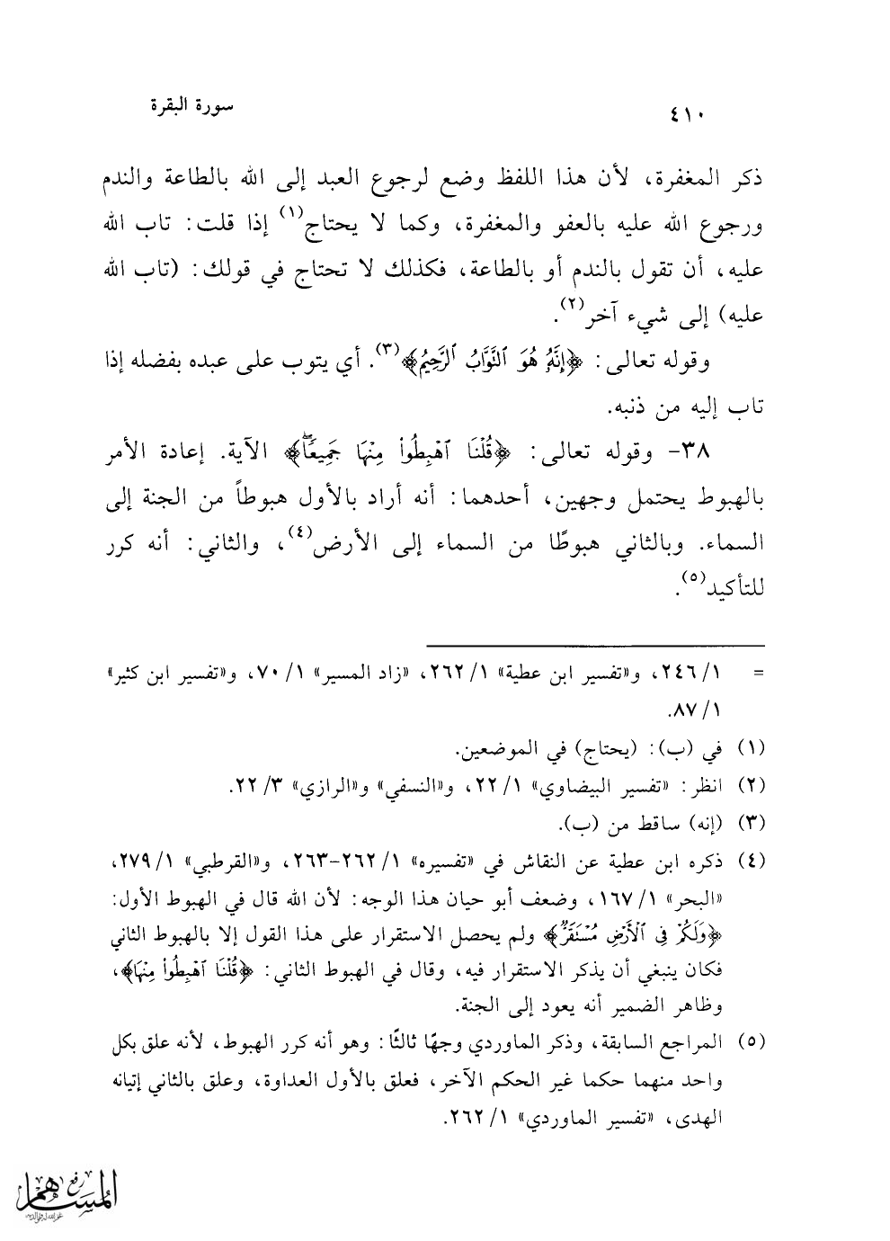 (¬5) المراجع السابقة، وذكر الماوردي وجهًا ثالثًا: وهو أنه كرر الهبوط، لأنه علق بكل واحد منهما حكما غير الحكم الآخر، فعلق بالأول العداوة، وعلق بالثاني إتيانه الهدى، "تفسير الماوردي" 1/ 262.