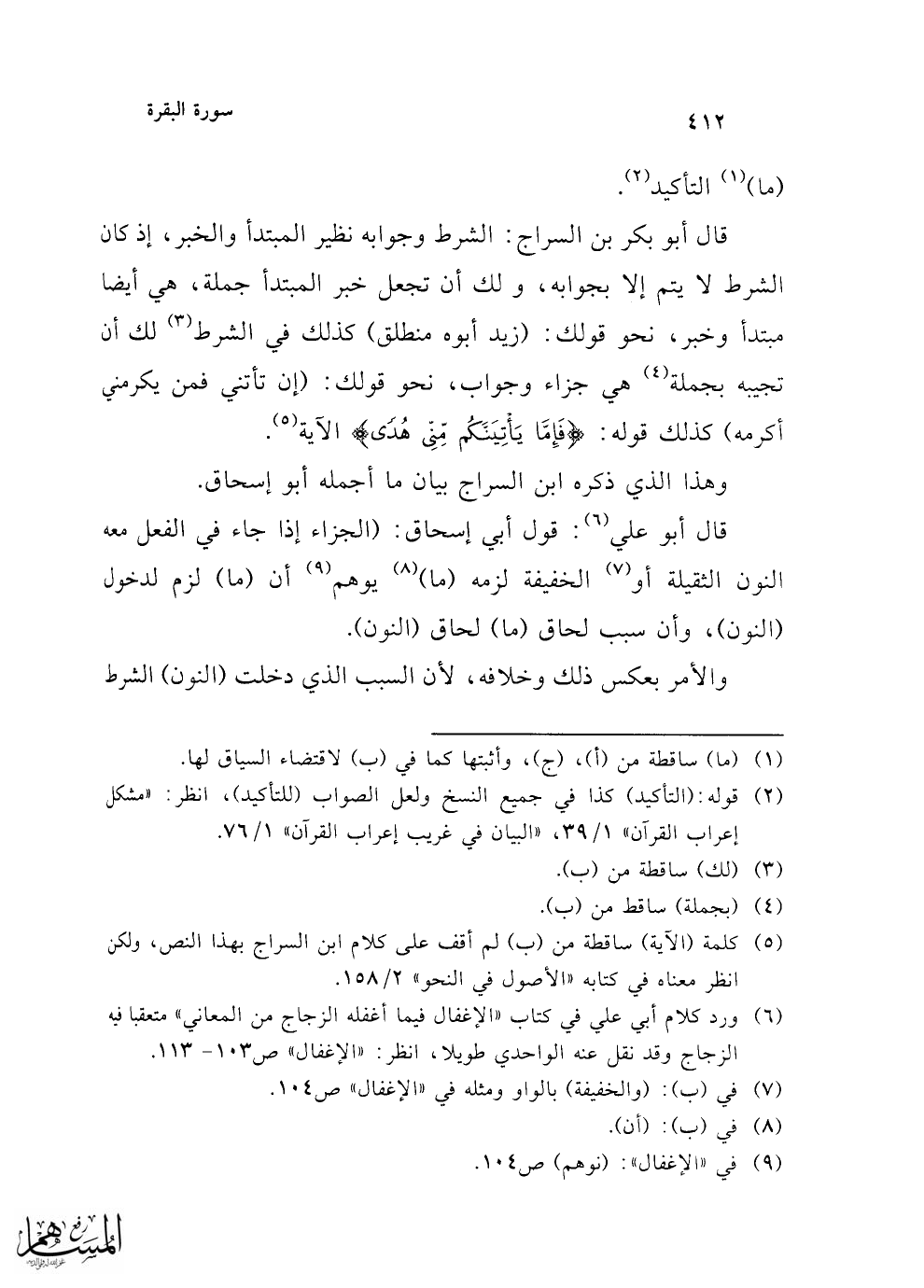 (¬2) قوله: (التأكيد) كذا في جميع النسخ ولعل الصواب (للتأكيد)، انظر: "مشكل إعراب القرآن" 1/ 39،"البيان في غريب إعراب القرآن" 1/ 76.