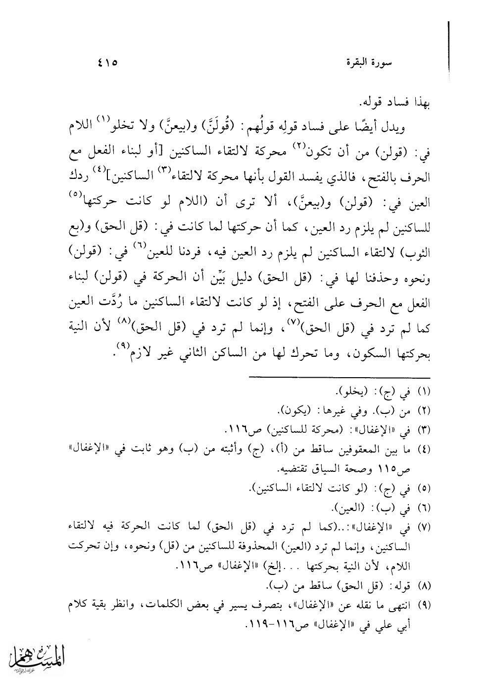 (¬7) في "الإغفال": .. (كما لم ترد في (قل الحق) لما كانت الحركة فيه لالتقاء الساكنين، وإنما لم ترد (العين) المحذوفة للساكنين من (قل) ونحوه، وإن تحركت اللام، لأن النية بحركتها ... إلخ) "الإغفال" ص 116.