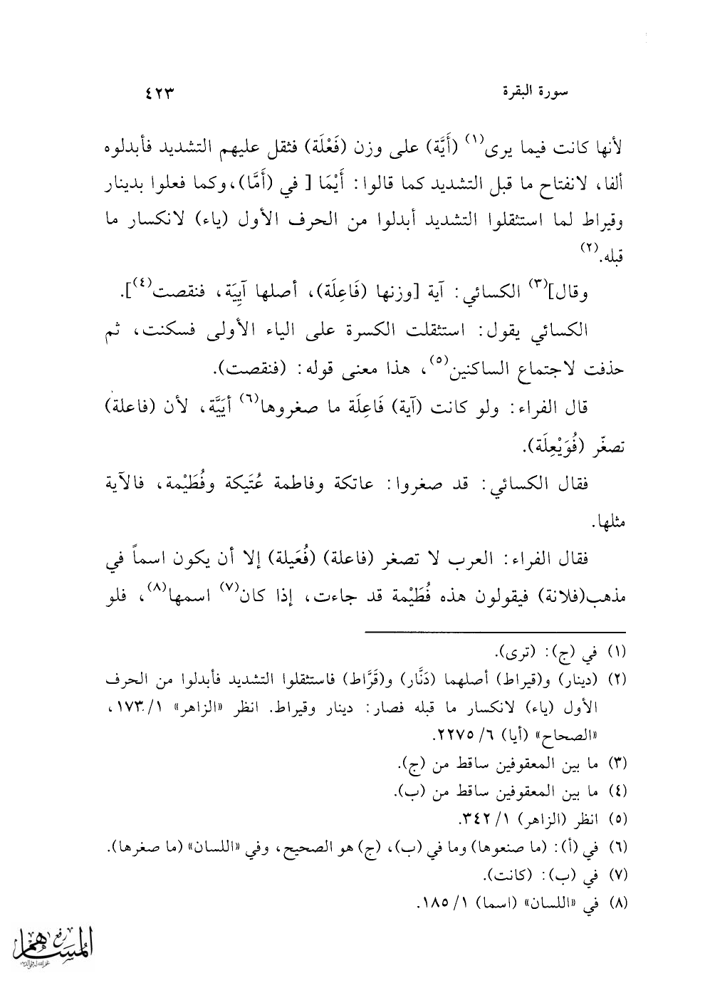 قال الفراء: ولو كانت (آية) فَاعِلَة ما صغروها (¬6) أيَيَّة، لأن (فاعلة) تصغّر (فُوَيْعِلَة).