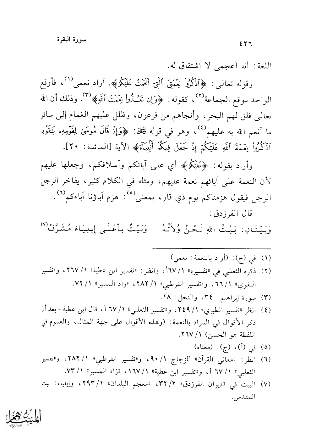 (¬4) انظر "تفسير الطبري" 1/ 249، و"تفسير الثعلبي" 1/ 67 أ، قال ابن عطية - بعد أن ذكر الأقوال في المراد بالنعمة: (وهذه الأقوال على جهة المثال، والعموم في اللفظة هو الحسن) 1/ 267.