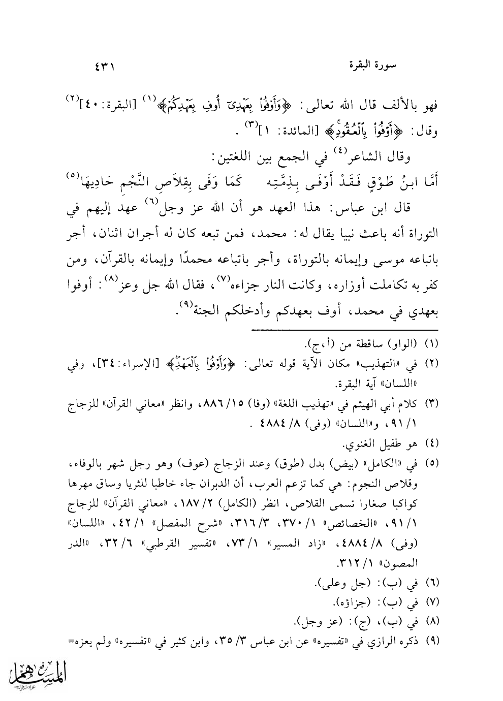 (¬2) في "التهذيب" مكان الآية قوله تعالى: {وَأَوْفُوا بِالْعَهْدِ} [الإسراء: 34] وفي "اللسان" آية البقرة.