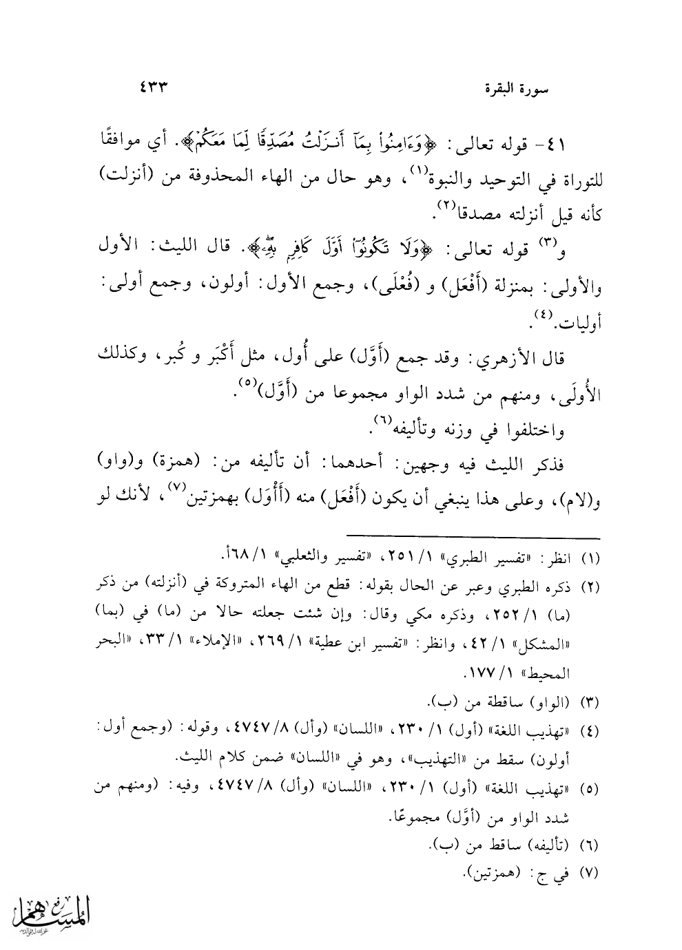 (¬5) "تهذيب اللغة" (أول) 1/ 230، "اللسان" (وأل) 8/ 4747، وفيه: (ومنهم من شدد الواو من (أوَّل) مجموعًا.