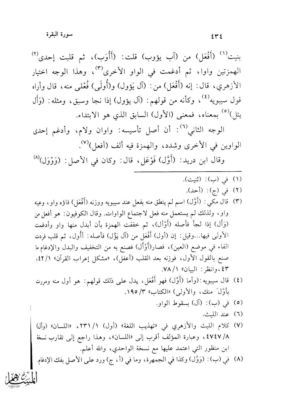 (¬3) قال مكي: (أَوَّل) اسم لم ينطق منه بفعل عند سيبويه ووزنه (أَفْعَل) فاؤه واو، وعينه واو، ولذلك لم يستعمل منه فعل لاجتماع الواوات. وقال الكوفيون: هو أفعل من (وَأَل) إذا لجأ فأصله (أَوْأل)، ثم خففت الهمزة بأن أبدل منها واو وأدغمت الأولى فيها ... وقيل: إن (أول) أَفْعَل من (آل يَؤُل) فأصله: أأْول، ثم قلب فردت الفاء في موضع (العين)، فصار (أَوْأَل) فصنع به من التخفيف والبدل والإدغام ما صنع بالقول الأول، فوزنه بعد القلب (أعفل)، "مشكل إعراب القرآن" 1/ 42، 43، وانظر: "البيان" 1/ 78.