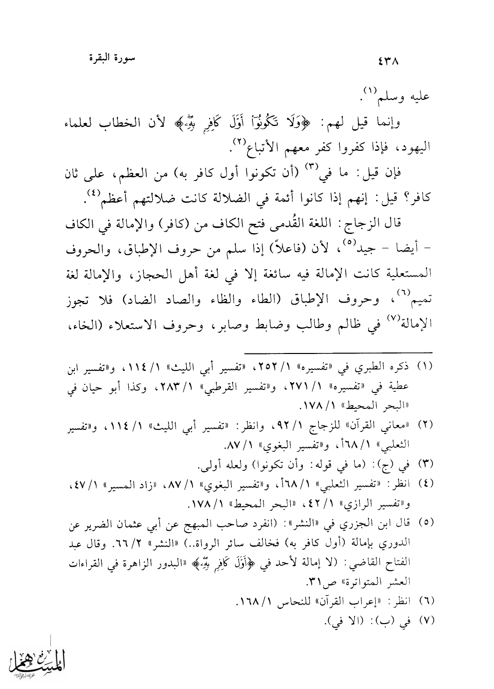 (¬5) قال ابن الجزري في "النشر": (انفرد صاحب المبهج عن أبي عثمان الضرير عن الدوري بإمالة (أول كافر به) فخالف سائر الرواة ..) "النشر" 2/ 66. وقال عبد الفتاح القاضي: (لا إمالة لأحد في {أَوَّلَ كَافِرٍ بِهِ} "البدور الزاهرة في القراءات العشر المتواترة" ص 31.