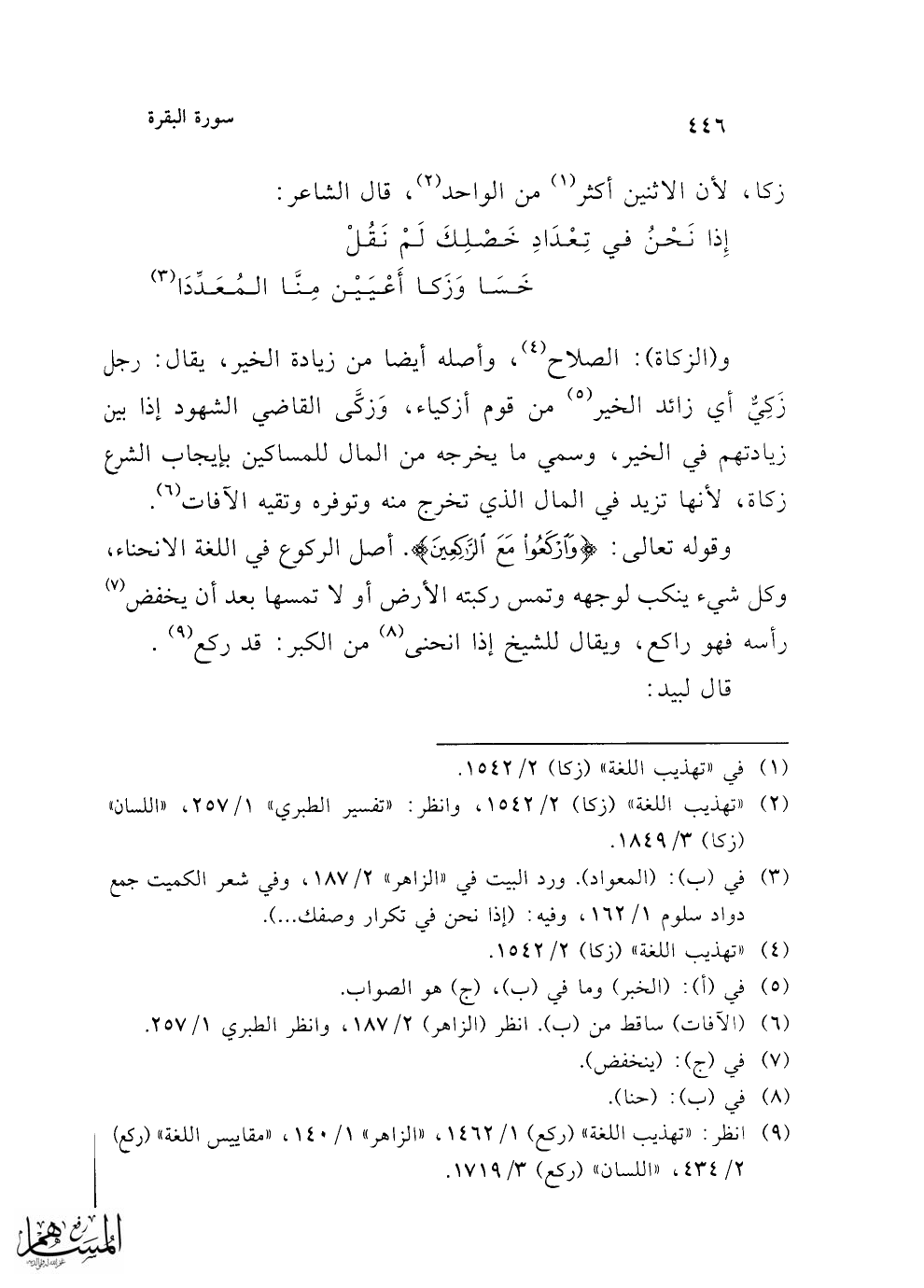 (¬2) "تهذيب اللغة" (زكا) 2/ 1542، وانظر: "تفسير الطبري" 1/ 257، "اللسان" (زكا) 3/ 1849.