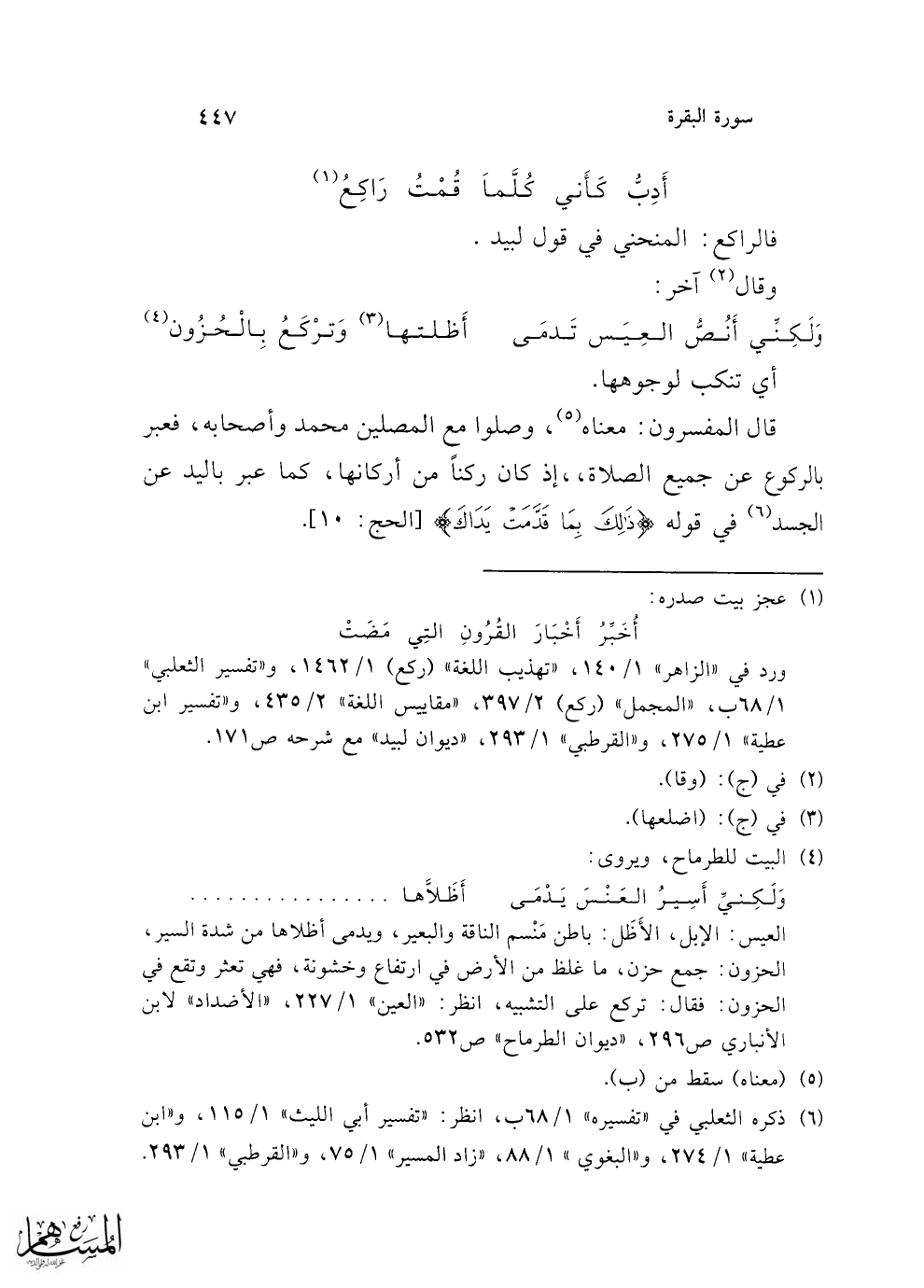 ورد في "الزاهر" 1/ 140، "تهذيب اللغة" (ركع) 1/ 1462، و"تفسير الثعلبي" 1/ 68 ب، "المجمل" (ركع) 2/ 397، "مقاييس اللغة" 2/ 435، و"تفسير ابن عطية" 1/ 275، و"القرطبي" 1/ 293، "ديوان لبيد" مع شرحه ص 171.