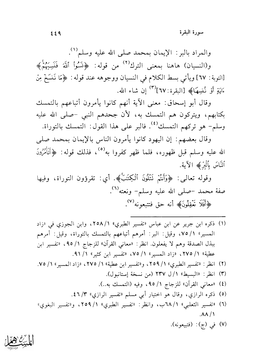 وقال أبو إسحاق: معنى الآية أنهم كانوا يأمرون أتباعهم بالتمسك بكتابهم، ويتركون هم التمسك به، لأن جحدهم النبي - صلى الله عليه وسلم- هو تركهم التمسك (¬4). فالبر على هذا القول: التمسك بالتوراة.