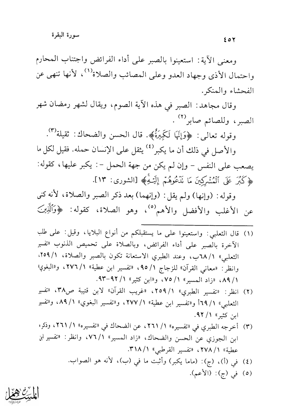 (¬1) قال الثعلبي: واستعينوا على ما يستقبلكم من أنواع البلايا, وقيل: على طلب الآخرة بالصبر على أداء الفرائض , وبالصلاة على تحميص الذنوب "تفسير الثعلبى" 1/ 68 ب, وعند الطبري الاستعانة تكون بالصبر والصلاة, 1/ 259, وانظر: "معانى القرآن" للزجاج 1/ 95, "تفسير ابن عطية" 1/ 276, و"البغوي" 1/ 89, "زاد المسير" 1/ 75, و"ابن كثير" 1/ 92 - 93.