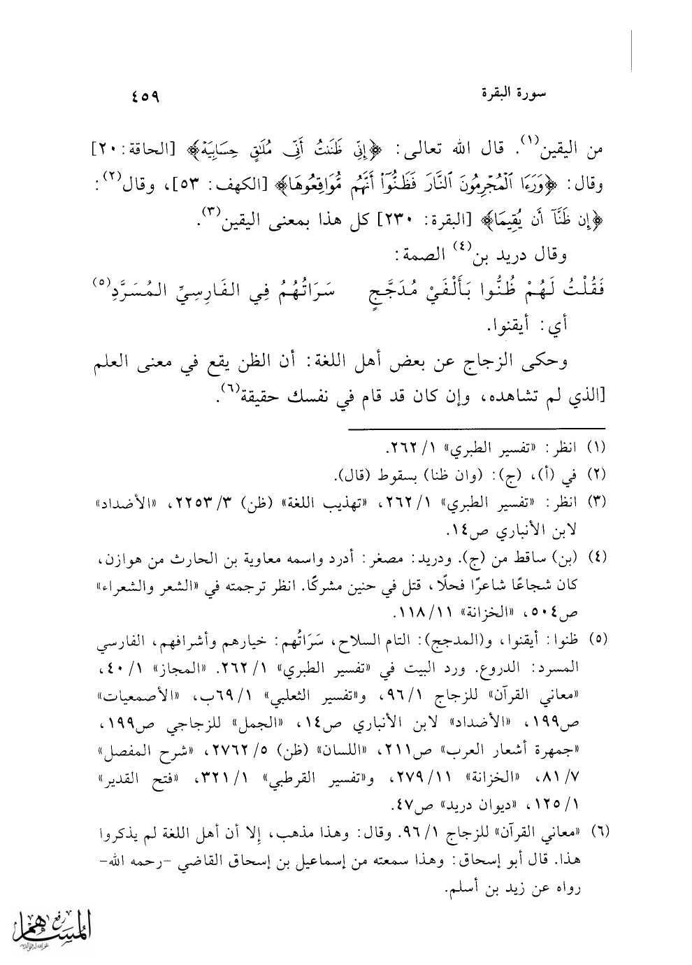 (¬3) انظر: "تفسير الطبري" 1/ 262، "تهذيب اللغة" (ظن) 3/ 2253، "الأضداد" لابن الأنباري ص 14.