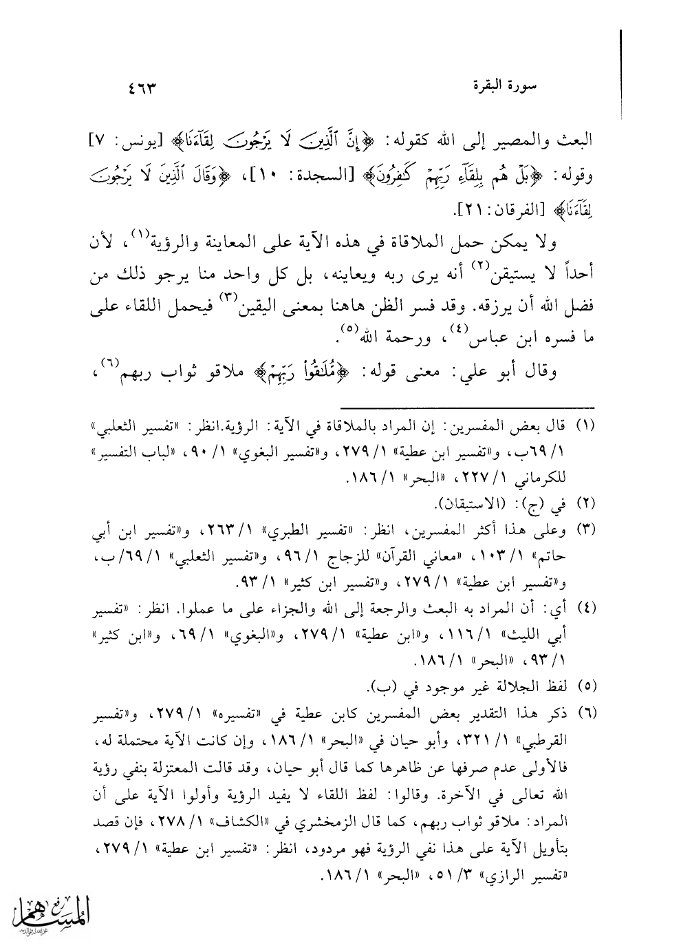(¬6) ذكر هذا التقدير بعض المفسرين كابن عطية في "تفسيره" 1/ 279، و"تفسير القرطبي" 1/ 321، وأبو حيان في "البحر" 1/ 186، وإن كانت الآية محتملة له، فالأولى عدم صرفها عن ظاهرها كما قال أبو حيان، وقد قالت المعتزلة بنفي رؤية الله تعالى في الآخرة. وقالوا: لفظ اللقاء لا يفيد الرؤية وأولوا الآية على أن المراد: ملاقو ثواب ربهم، كما قال الزمخشري في "الكشاف" 1/ 278، فإن قصد بتأويل الآية على هذا نفي الرؤية فهو مردود، انظر: "تفسير ابن عطية" 1/ 279، "تفسير الرازي" 3/ 51، "البحر" 1/ 186.