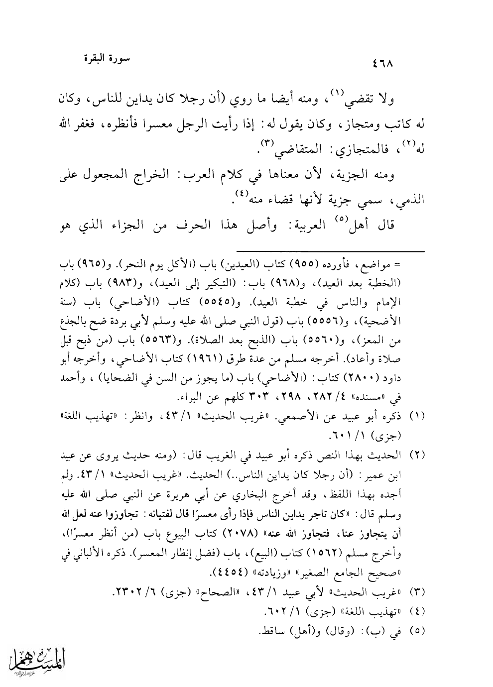 (¬3) "غريب الحديث" لأبي عبيد 1/ 43، "الصحاح" (جزى) 6/ 2302.