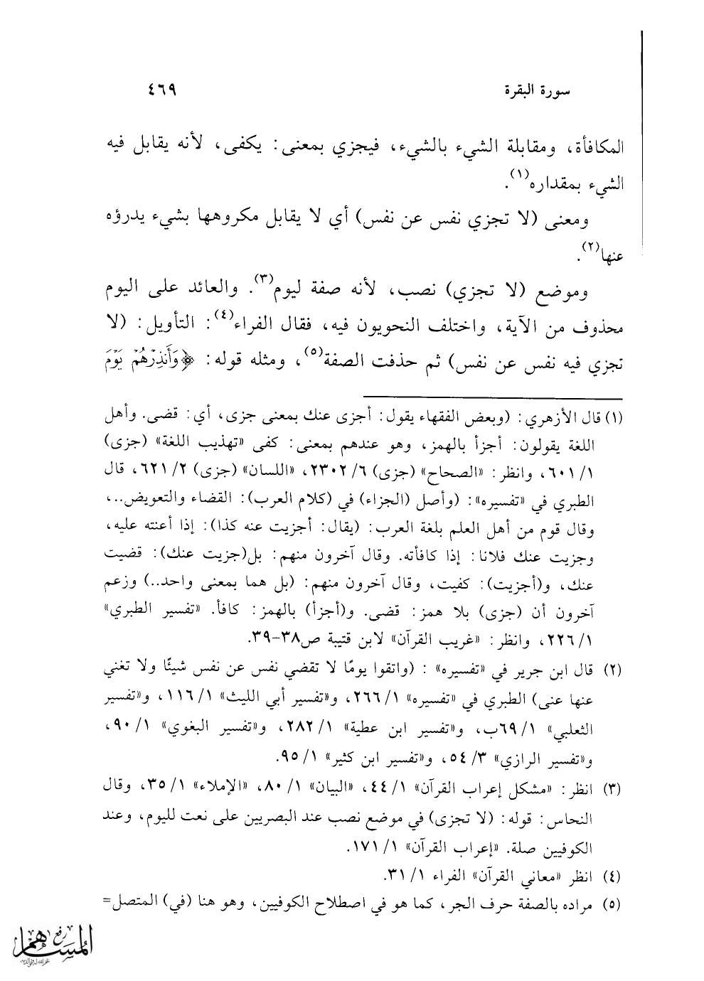 (¬2) قال ابن جرير في "تفسيره": (واتقوا يومًا لا تقضي نفس عن نفس شيئًا ولا تغني عنها عنى) الطبري في "تفسيره" 1/ 266، و"تفسير أبي الليث" 1/ 116، و"تفسير الثعلبي" 1/ 69ب، و"تفسير ابن عطية" 1/ 282، و"تفسير البغوي" 1/ 90، و"تفسير الرازي" 3/ 54، و"تفسير ابن كثير" 1/ 95.