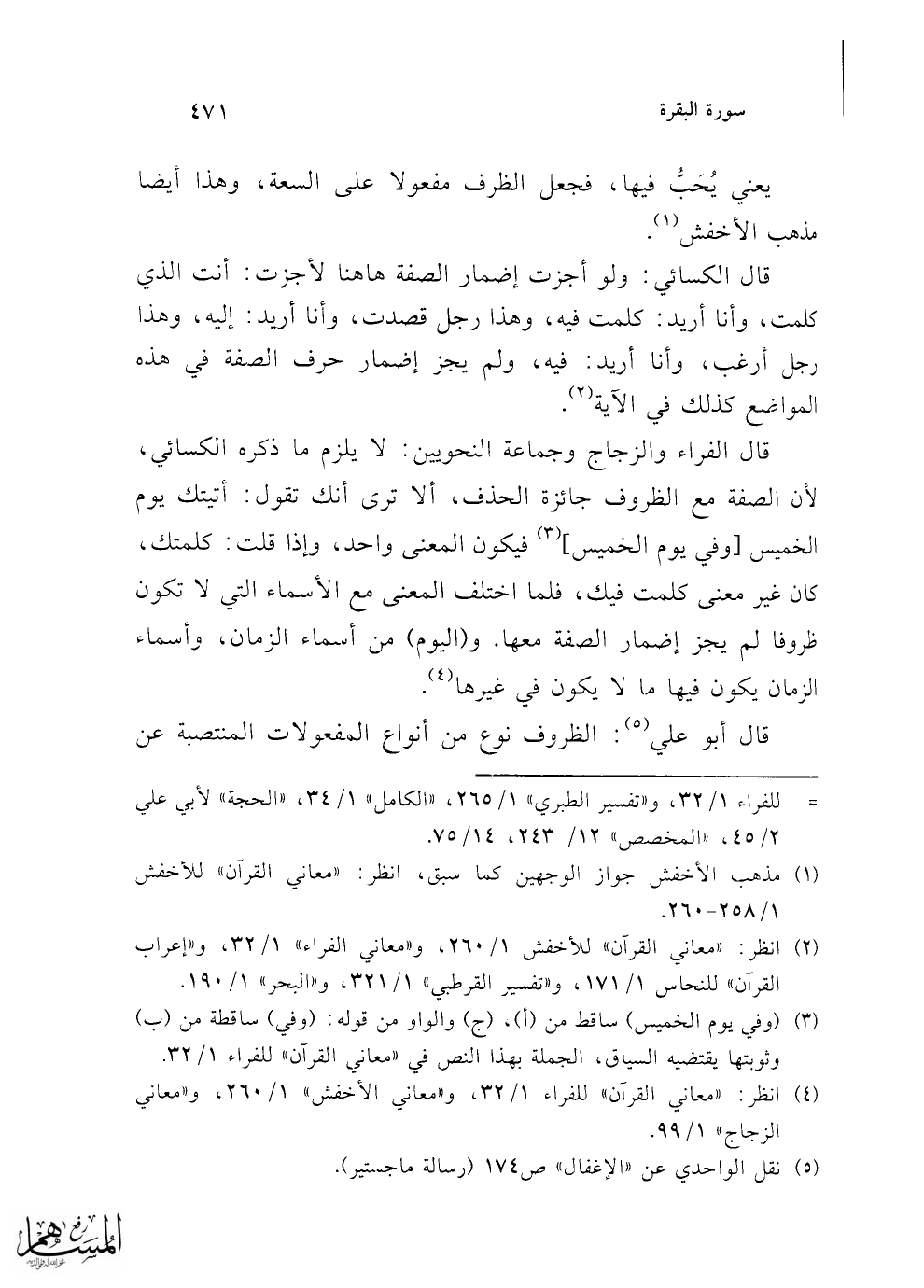 (¬2) انظر: "معاني القرآن" للأخفش 1/ 260، و"معاني الفراء" 1/ 32، و"إعراب القرآن" للنحاس 1/ 171، و"تفسير القرطبي" 1/ 321، و"البحر" 1/ 190.