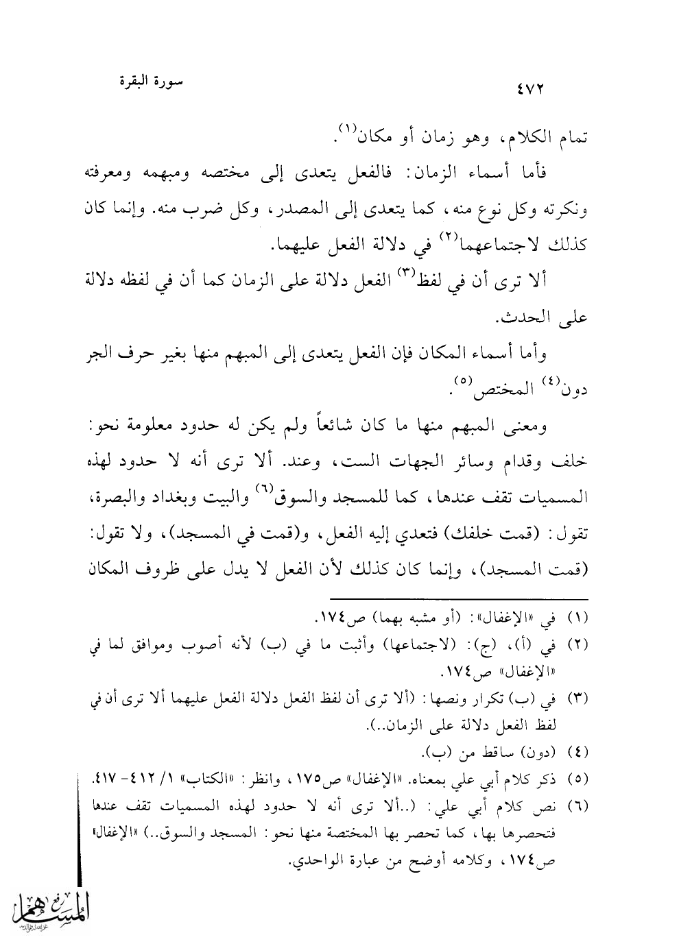 (¬6) نص كلام أبي علي: (.. ألا ترى أنه لا حدود لهذه المسميات تقف عندها فتحصرها بها، كما تحصر بها المختصة منها نحو: المسجد والسوق ..) "الإغفال" ص 174، وكلامه أوضح من عبارة الواحدي.