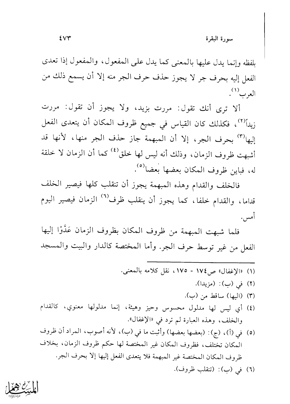 (¬5) في (أ)، (ج): (بعضها بعضها) وأثبت ما في (ب)، لأنه أصوب، المراد أن ظروف المكان تختلف، فظروف المكان غير المختصة لها حكم ظروف الزمان، بخلاف ظروف المكان المختصة غير المبهمة فلا يتعدى الفعل إليها إلا بحرف الجر.