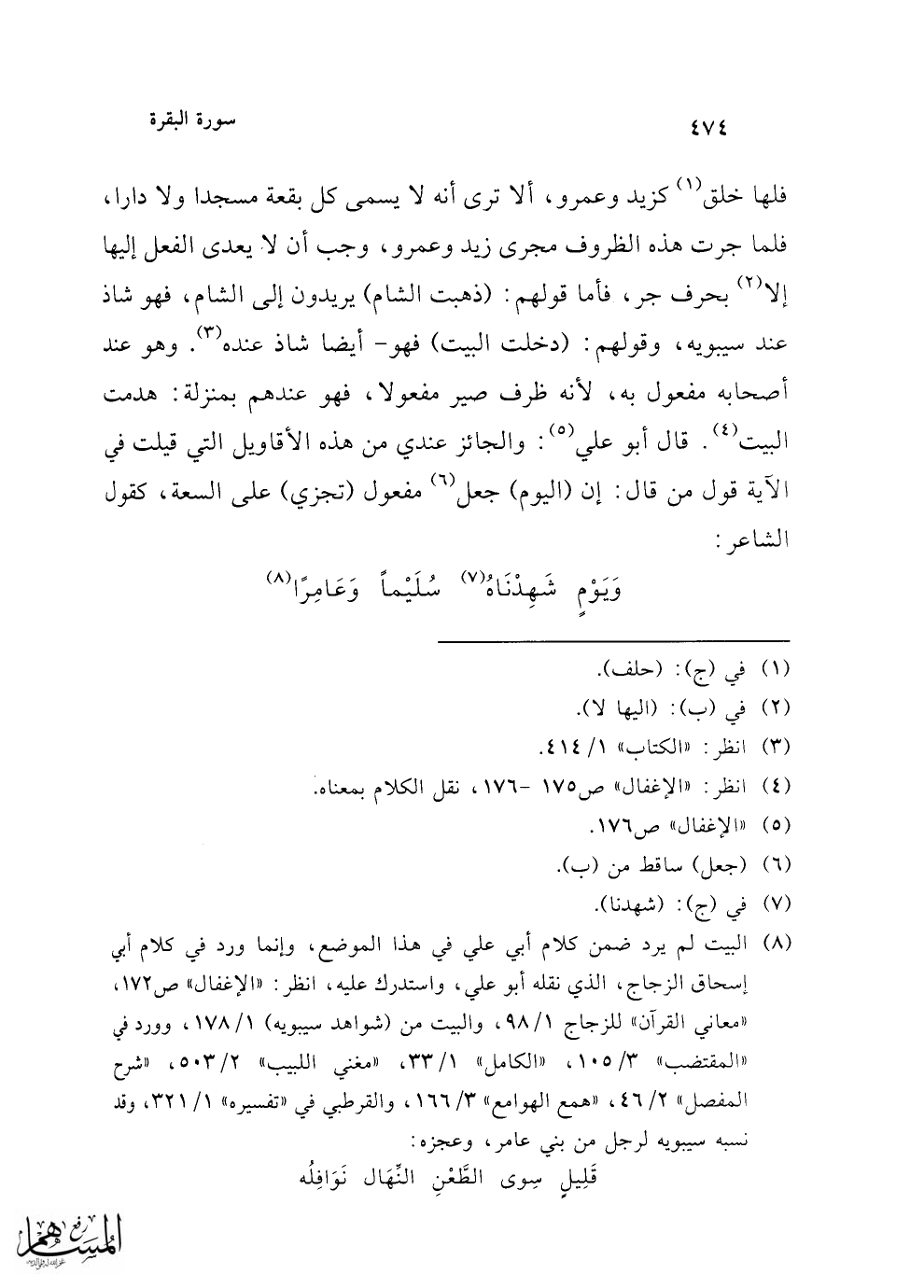 (¬8) البيت لم يرد ضمن كلام أبي علي في هذا الموضع، وإنما ورد في كلام أبي إسحاق الزجاج، الذي نقله أبو علي، واستدرك عليه، انظر: "الإغفال" ص 172، "معاني القرآن" للزجاج 1/ 98، والبيت من (شواهد سيبويه) 1/ 178، وورد في "المقتضب" 3/ 105، "الكامل" 1/ 33، "مغني اللبيب" 2/ 503، "شرح المفصل" 2/ 46، "همع الهوامع" 3/ 166، والقرطبي في "تفسيره" 1/ 321، وقد نسبه سيبويه لرجل من بني عامر، وعجزه: