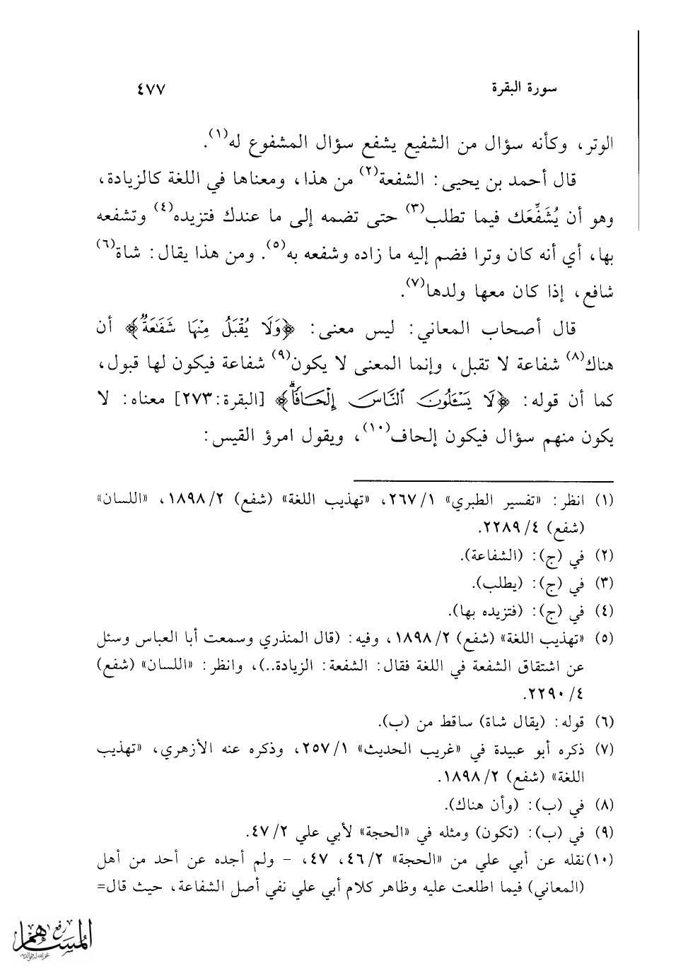 (¬10) نقله عن أبي علي من "الحجة" 2/ 46، 47، - ولم أجده عن أحد من أهل (المعاني) فيما اطلعت عليه وظاهر كلام أبي علي نفي أصل الشفاعة، حيث قال =