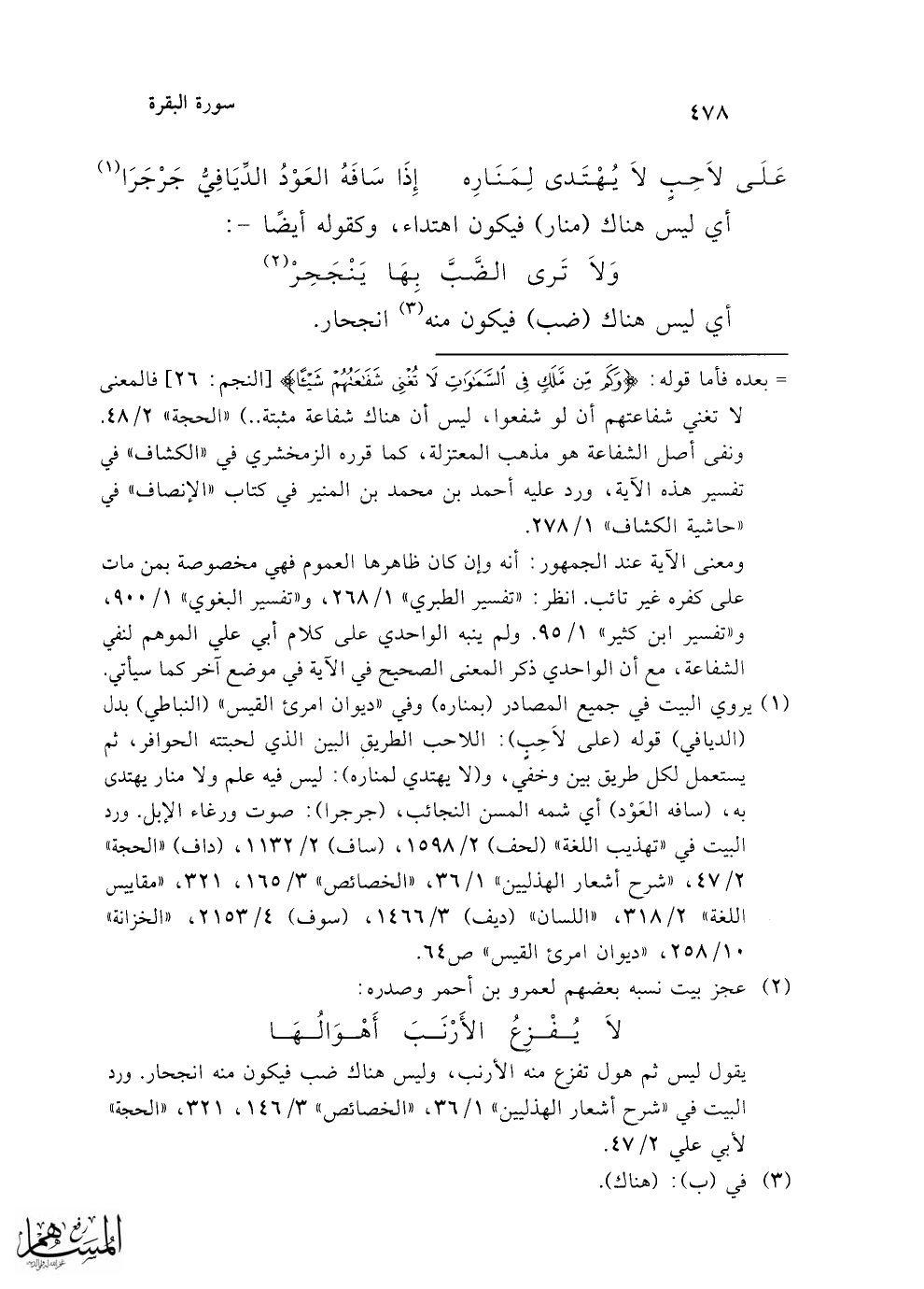 = بعده فأما قوله: {وَكَمْ مِنْ مَلَكٍ فِي السَّمَاوَاتِ لَا تُغْنِي شَفَاعَتُهُمْ شَيْئًا} [النجم: 26]، فالمعنى لا تغني شفاعتهم أن لو شفعوا، ليس أن هناك شفاعة مثبتة ..) "الحجة" 2/ 48. ونفى أصل الشفاعة هو مذهب المعتزلة، كما قرره الزمخشري في "الكشاف" في تفسير هذه الآية، ورد عليه أحمد بن محمد بن المنير في كتاب "الإنصاف" في "حاشية الكشاف" 1/ 278.