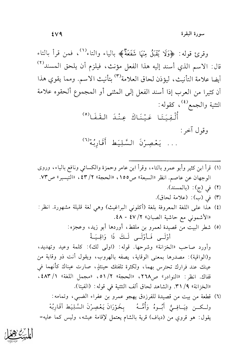 وقرئ قوله: {وَلَا يُقْبَلُ مِنْهَا شَفَاعَةٌ} بالياء والتاء (¬1)، فمن قرأ بالتاء قال: الاسم الذي أسند إليه هذا الفعل مؤنث، فيلزم أن يلحق المسند (¬2) أيضا علامة التأنيث، ليؤذن لحاق العلامة (¬3) بتأنيث الاسم. ومما يقوي هذا أن كثيرا من العرب إذا أسند الفعل إلى المثنى أو المجموع ألحقوه علامة التثنية والجمع (¬4)، كقوله: