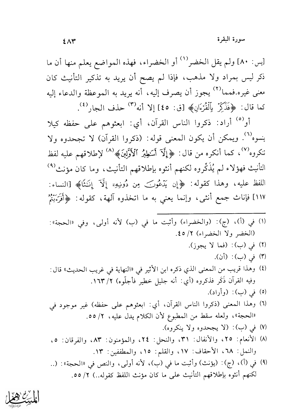 [يس: 80] ولم يقل الخضر (¬1) أو الخضراء، فهذه المواضع يعلم منها أن ما ذكر ليس بمراد ولا مذهب، فإذا لم يصح أن يريد به تذكير التأنيث كان معنى غيره. فمما (¬2) يجوز أن يصرف إليه، أنه يريد به الموعظة والدعاء إليه كما قال: {فَذَكِّرْ بِالْقُرْآنِ} [ق: 45] إلا أنه (¬3) حذف الجار (¬4).