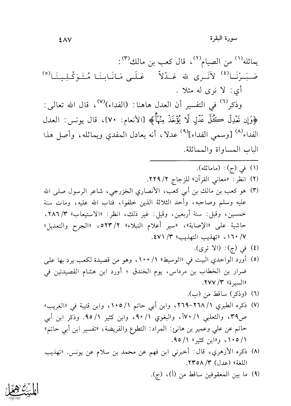 (¬5) أورد الواحدي البيت فى "الوسيط" 1/ 100، وهو من قصيدة لكعب يرد بها على ضرار بن الخطاب بن مرداس، يوم الخندق؛ أورد ابن هشام القصيدتين في "السيرة" 3/ 277.
